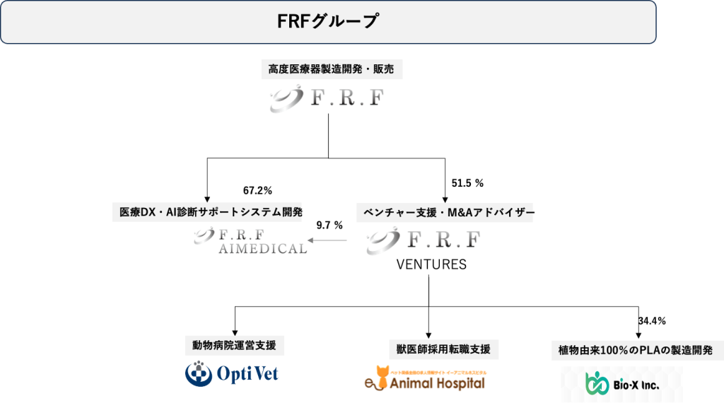 About Us company profile 会社概要 会社名:株式会社エフアールエフジャパン本社:〒168-0074 東京都杉並区上高井戸1丁目14-4設立:2016年3月16日代表取締役:早田 明事業内容:・人医療及び動物医療向け医療機器の製造・販売・遠隔医療システム及び電子カルテシステムの受託開発及びシステム提供・病院内装のデザイン設計及び建築施工プロデュース保有免許:・医療機器製造業登録(登録番号:13BZ201586)・第二種医療機器製造販売業許可(許可番号:13B2X10500)・動物用医療機器製造業登録(28製造療第532号)・第二種動物用医療機器製造販売業許可(28製販療II第181号)・高度管理医療機器等販売業・貸与業許可(許可番号:4杉保衛薬第469号)取引先:・新大阪病院・明芳病院・ダクタリ動物病院関西医療センター(イオンペット株式会社)・セルトラスト・アニマル・セラピューティクス株式会社仕入先:・キヤノンメディカルシステムズ株式会社・パラマウントベッド株式会社・株式会社エクセル・クリエイツ出資先:(株)FRF Ventures(出資比率63.8%)(株)FRF AI MEDICAL(出資比率74.5%)バイオエックス(株)(出資比率34.4%)